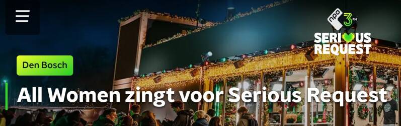 Een afvaardiging van Vocaal Ensemble All Women uit Rosmalen en Den Bosch gaat zingen voor Serious Request! Op dinsdag 23 december starten we rond 18 uur in de stationshal in Den Bosch. Daarna trekken we de stad in om op meerdere plekken te zingen. We hopen geld op te halen met verschillende kerstliedjes uit ons repertoire. Maar een donatie op voorhand (of achteraf) is natuurlijk ook welkom!